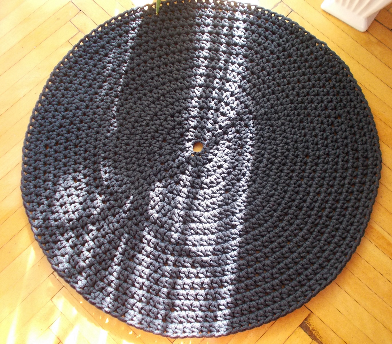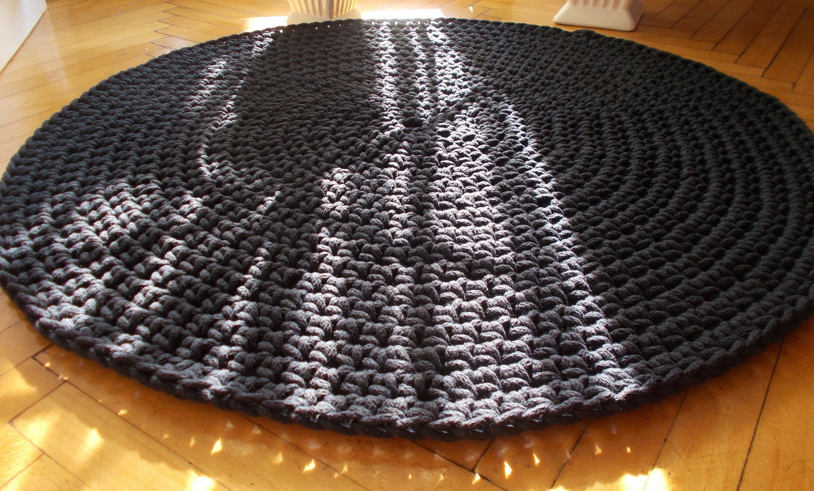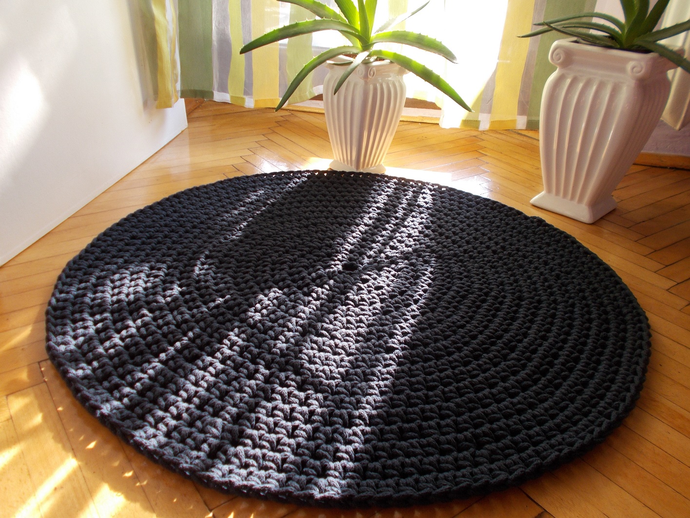 Dywan wykonany ręcznie gęstym splotem. Średnica 100 cm. Dywan jest dwustronny, posiada wzmocniony brzeg, dzięki czemu nie wywija się i ładnie przylega do podłogi. Ozdobi każde wnętrze, zarówno nowoczesne jak i tradycyjne. Zastosowany materiał – 5 mm sznurek w 100% bawełniany, bezpieczny również dla dzieci z alergią. Łatwy w utrzymaniu w czystości, można prać w temp. 30 st. Autorski projekt i wykonanie.