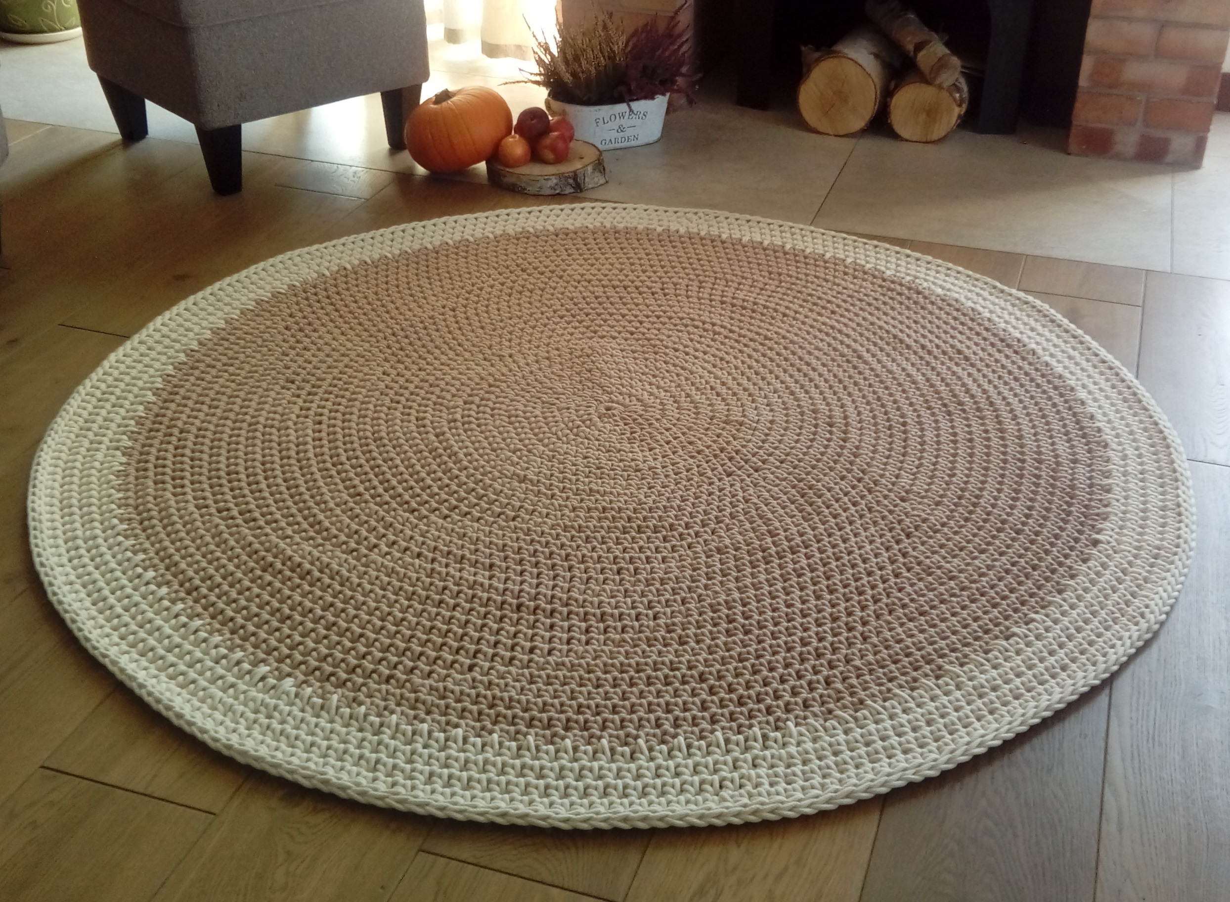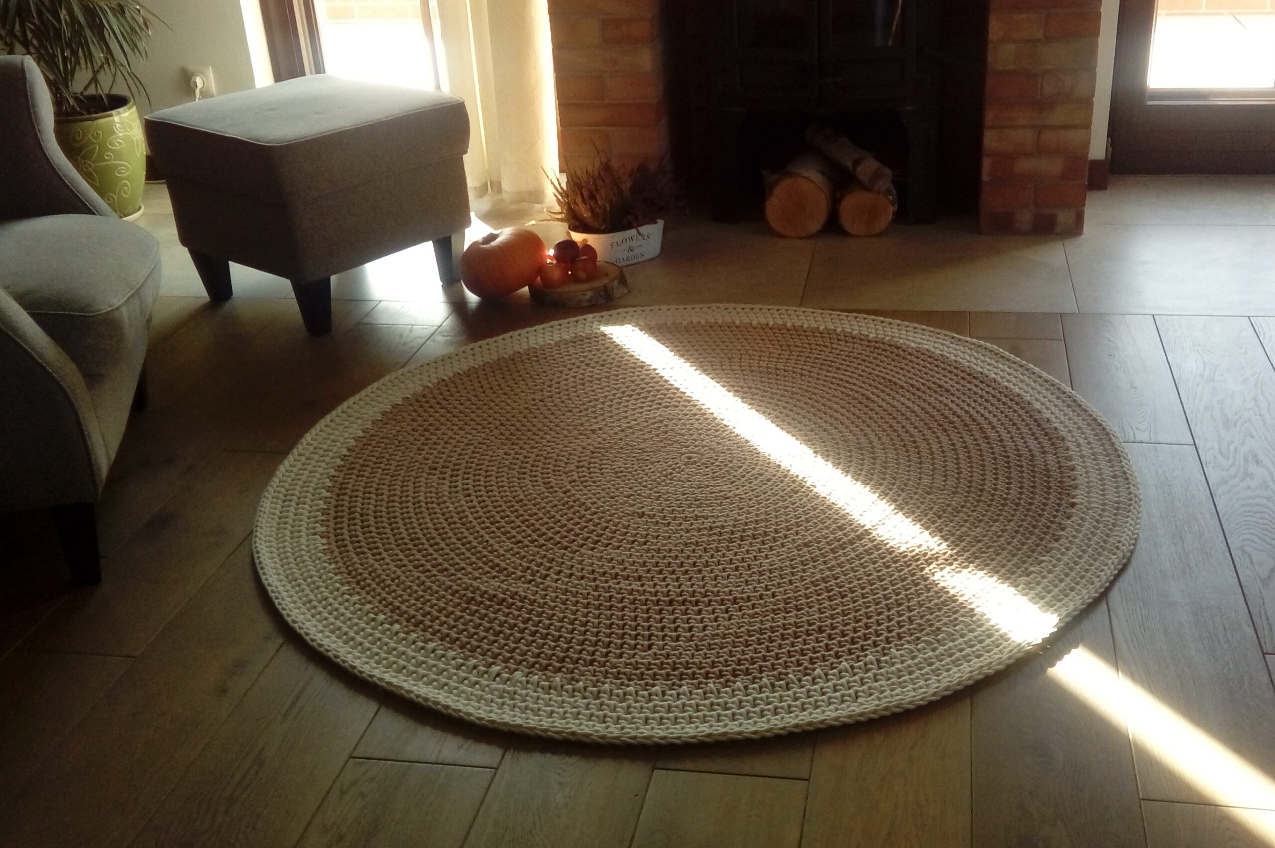 Dywan wykonany ręcznie gęstym splotem. Kolory: kartonowy oraz ecru. Średnica 150 cm. Dywan jest dwustronny, dobrze przylega do podłogi. Ozdobi każde wnętrze, zarówno nowoczesne jak i tradycyjne. Zastosowany materiał – 5 mm sznurek w 100% bawełniany, bezpieczny również dla dzieci z alergią. Łatwy w utrzymaniu w czystości, można prać w temp. 30 st.