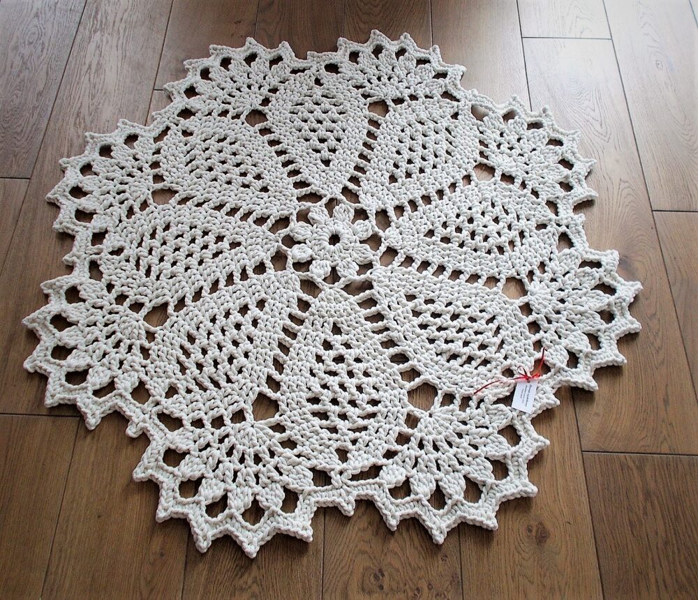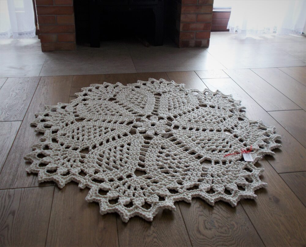 Dywan wykonany ręcznie. Średnica 120 cm. Dywan jest dwustronny, posiada wzmocniony, ozdobny brzeg, dzięki czemu nie wywija się i dobrze przylega do podłogi. Oryginalna i na czasie ozdoba salonu lub pokoju dziecięcego. Zastosowany materiał – 5 mm sznurek w 100% bawełniany, bezpieczny również dla dzieci z alergią. Można prać w temp. 30 st.