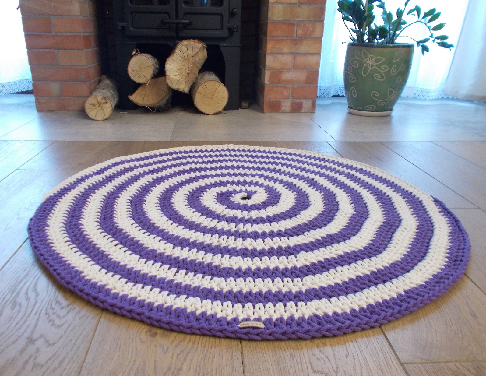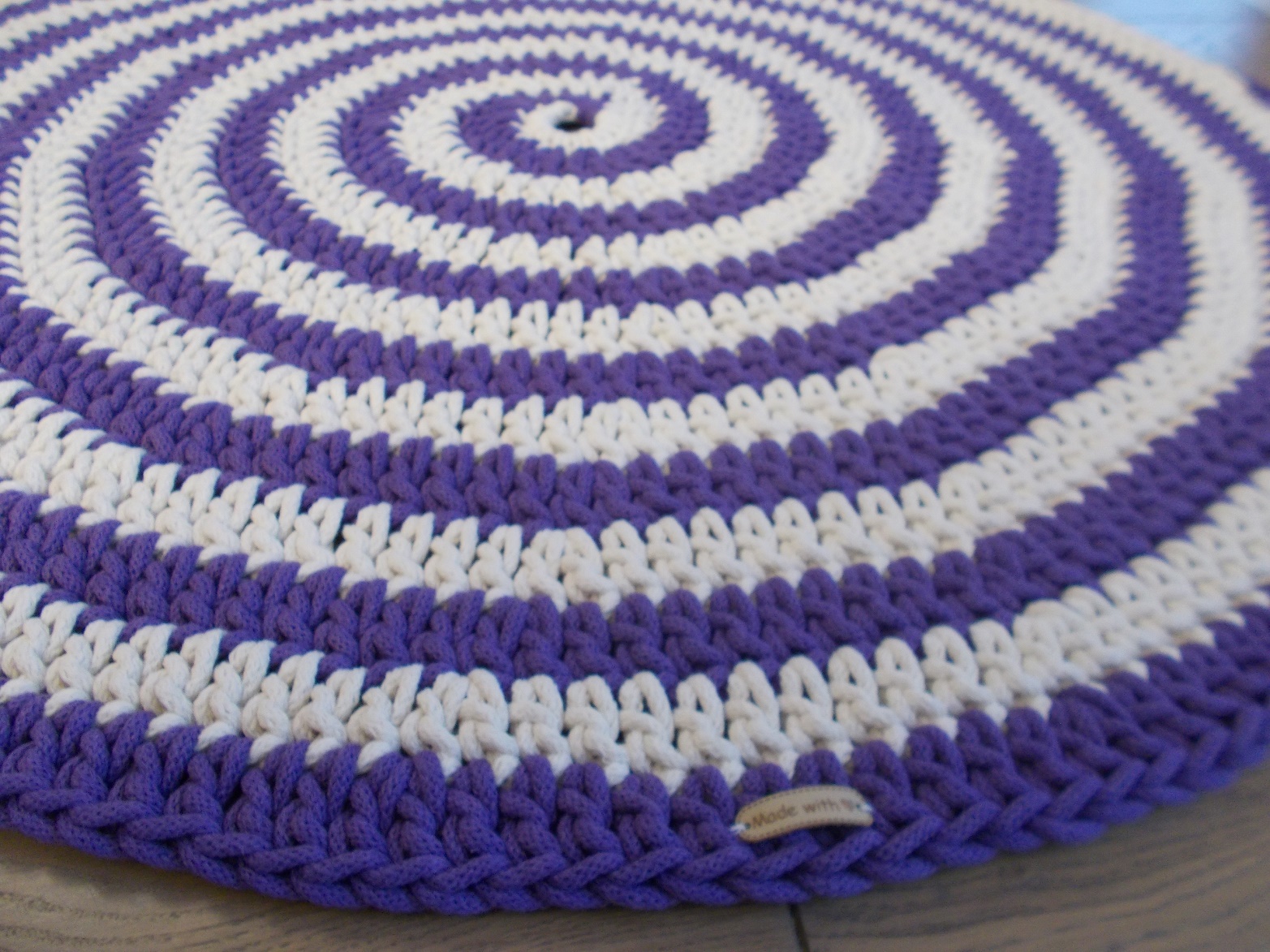 Dywan wykonany ręcznie, dwustronny, średnica 100 cm. Oryginalna ozdoba salonu lub pokoju dziecięcego. Zastosowany materiał – 5 mm sznurek w 100% bawełniany bezpieczny również dla dzieci z alergią. Sznurek najwyższej jakości wyłącznie od polskich producentów. Można prać w temp. 30 st.