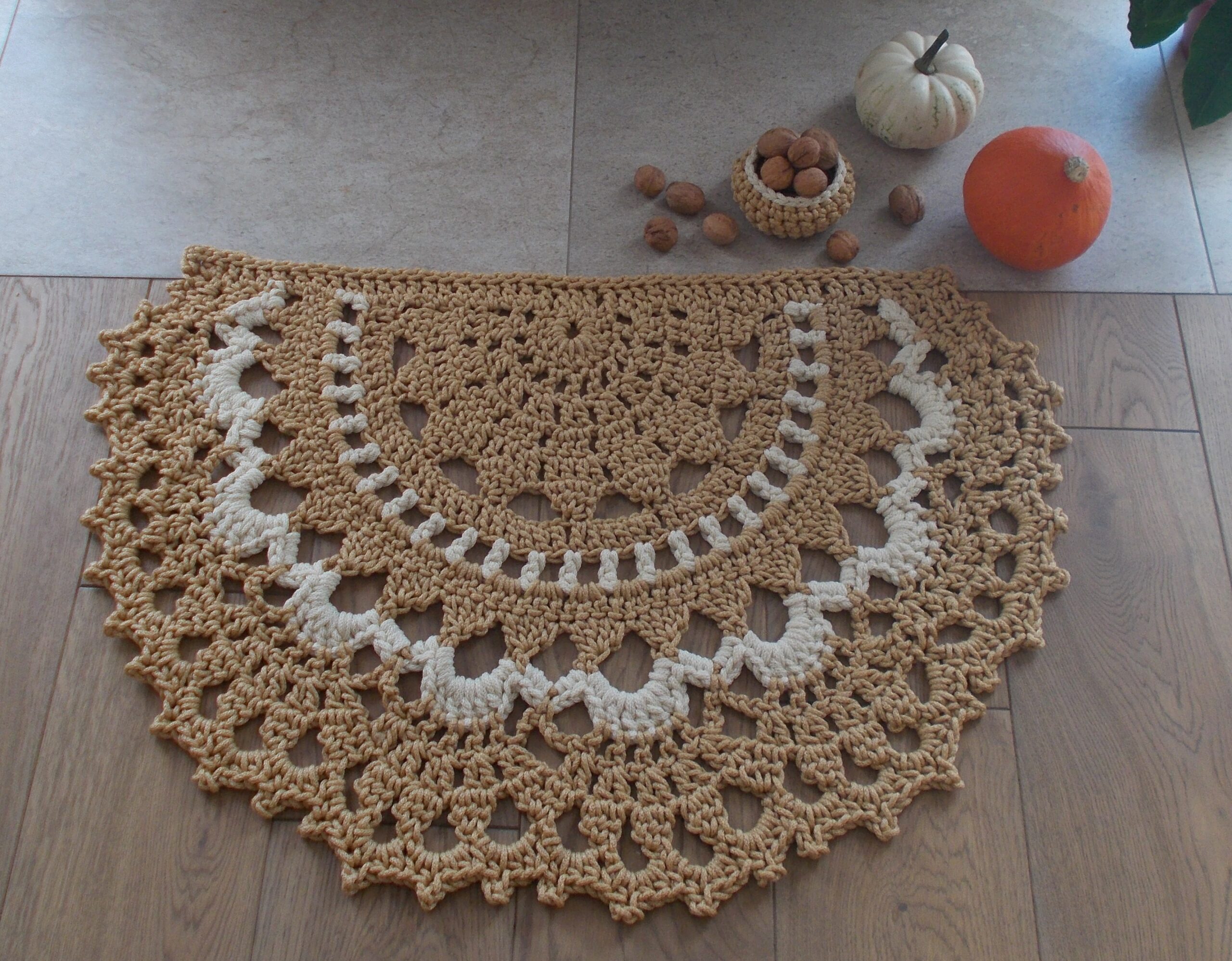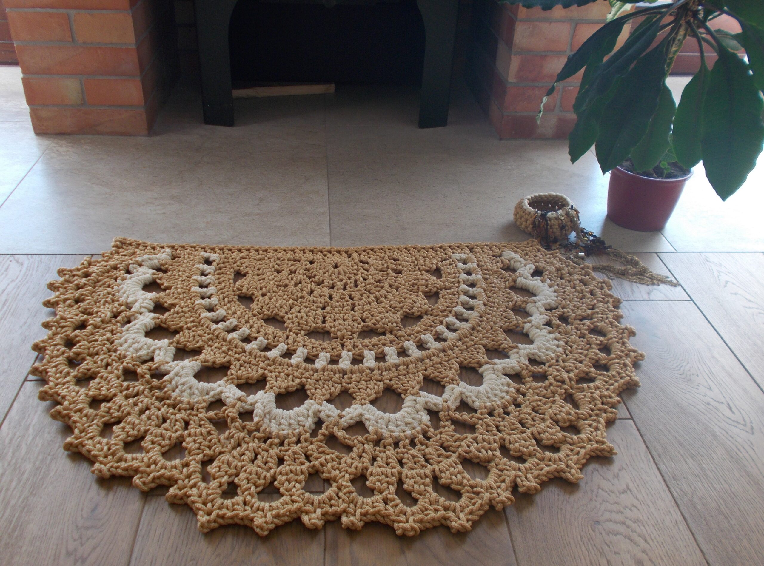 Dywan w formie półkola wykonany ręcznie. Wymiary 87 x 57 cm, kolor stare złoto z połyskiem i kremowy. Starannie wykonany, zakończony wzmocnionym ozdobnym brzegiem, nie wywija się i ładnie układa. Oryginalna ozdoba salonu, pokoju dziecięcego, przedpokoju lub łazienki. Doda uroku każdemu wnętrzu, zarówno tradycyjnemu jak i nowoczesnemu. Można również używać go jako grubą serwetę na stół lub komodę. Zastosowany materiał – 5,5 mm poliestrowy sznurek, dzięki czemu dywan jest bardzo trwały i odporny na płowienie. Dywan jest dwustronny.