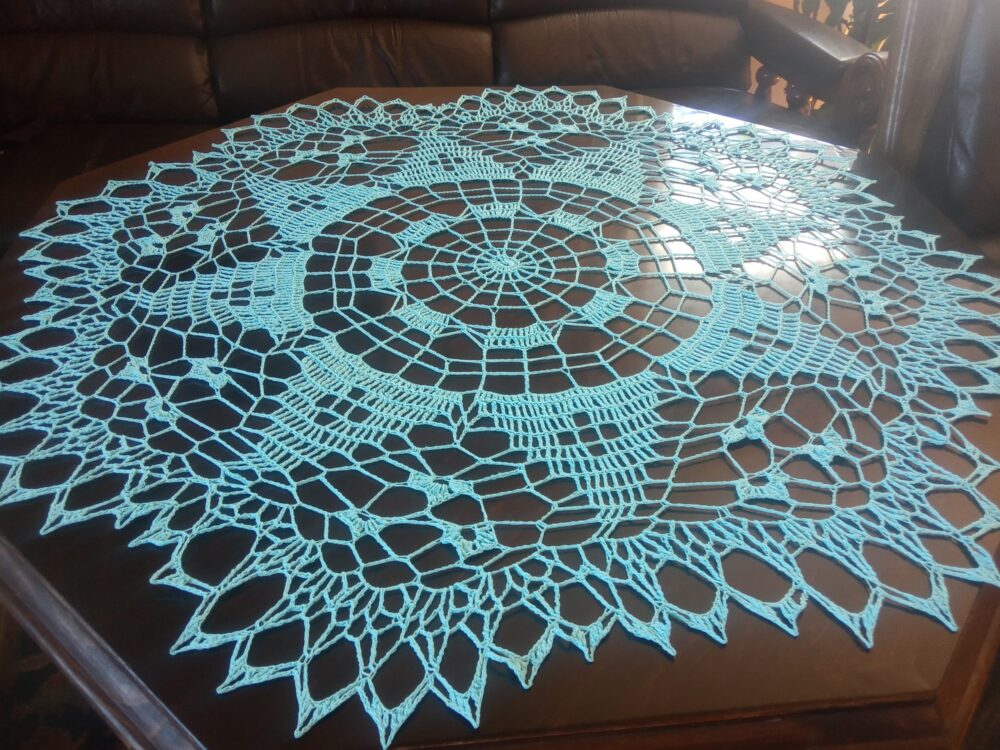 Ażurowy obrus w całości wykonany ręcznie. Bardzo dekoracyjny, ozdobi każde wnętrze i doda mu energii kolorem.