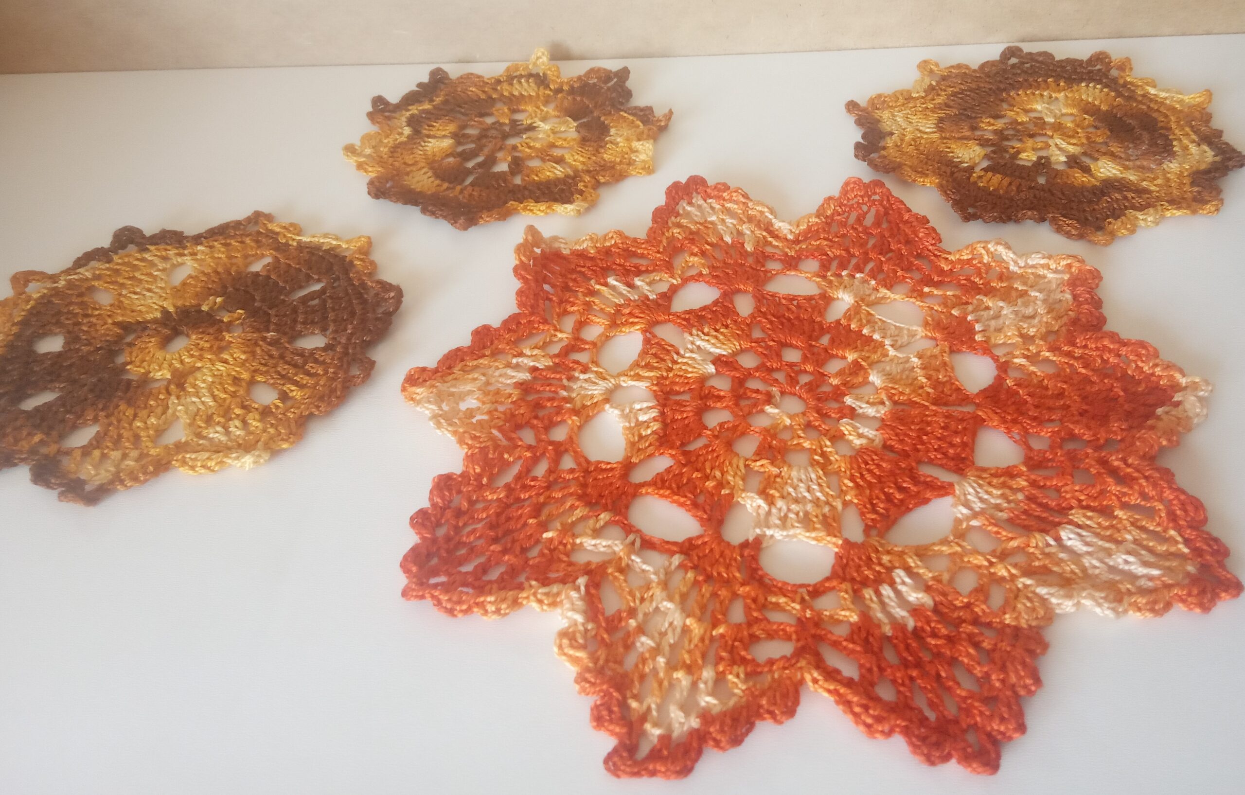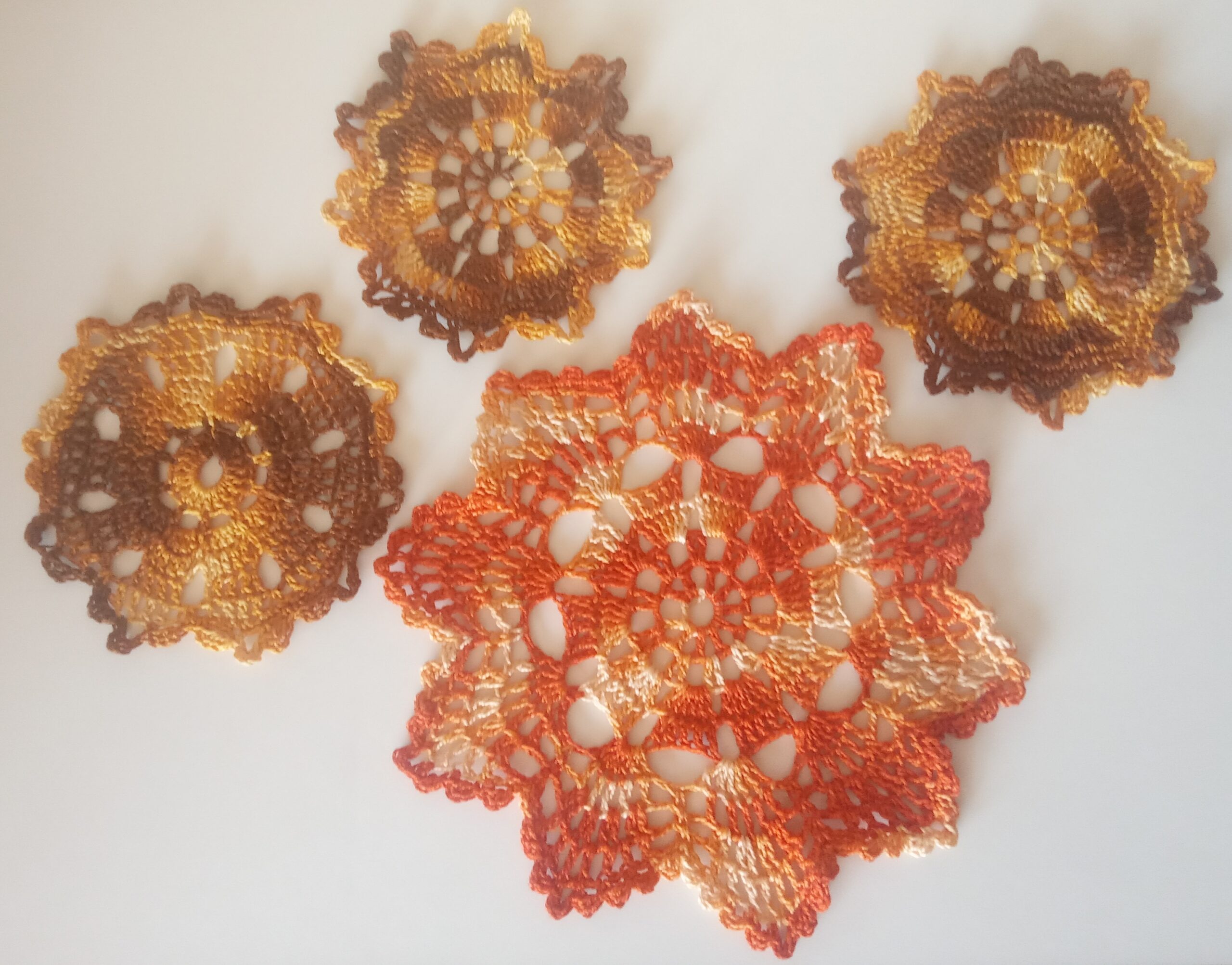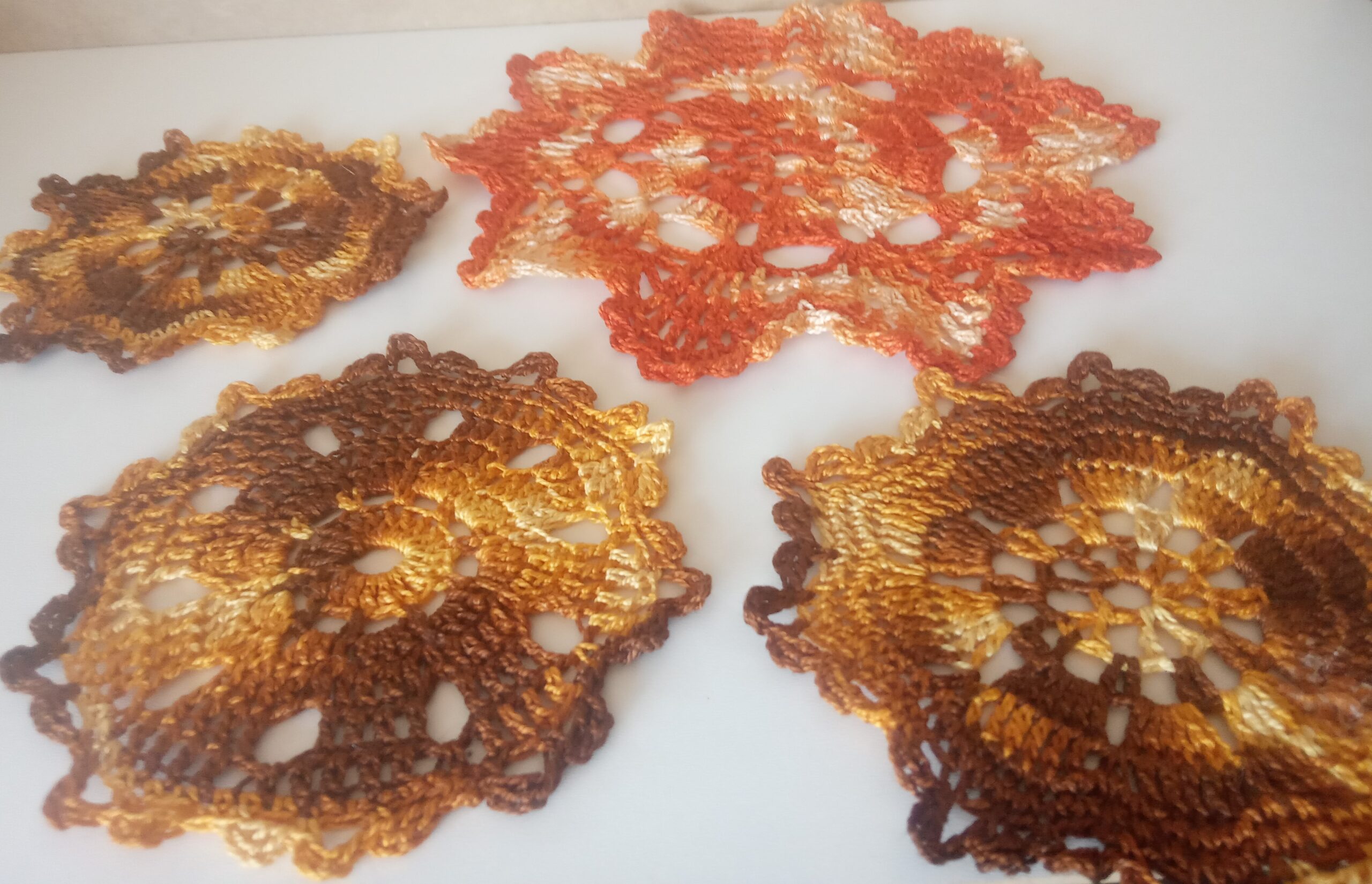 Komplet 4 uroczych serwetek wykonanych ręcznie z cieniowanego kordonka w kolorach Złotej jesieni.