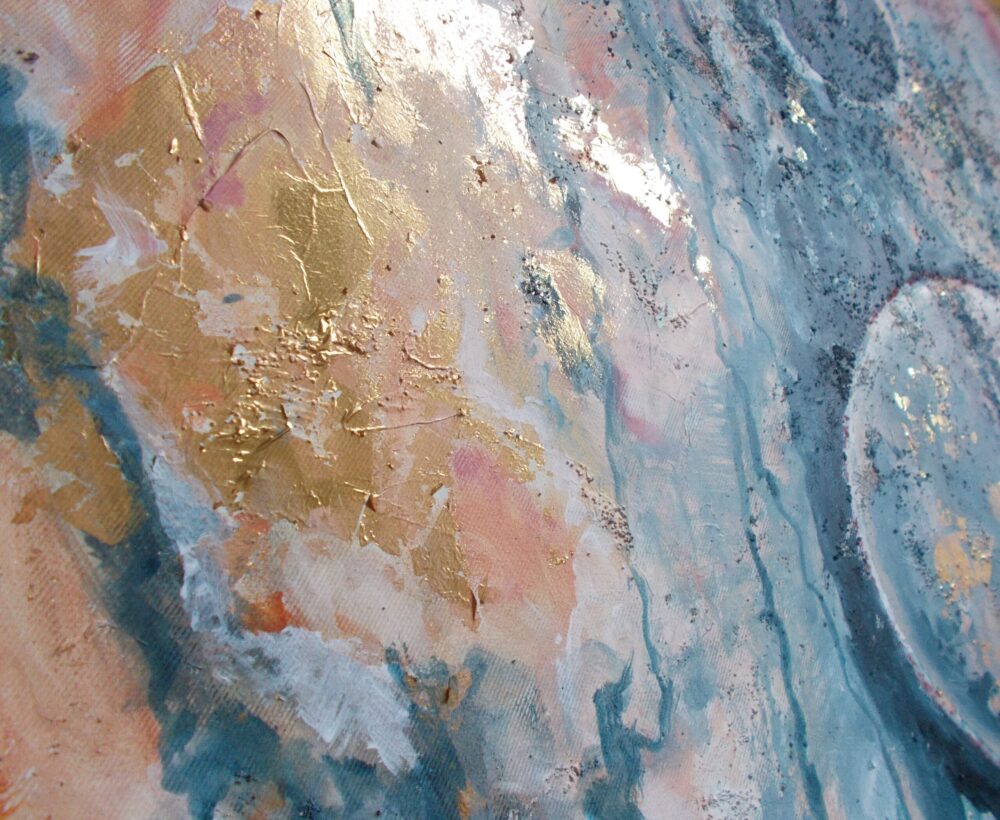 Wymiary: 60 cm x 60 cm. Płótno na sosnowym blejtramie wzmocnionym dodatkową poprzeczką. Boki zamalowane w formie kontynuacji. Technika mieszana: akryl, struktura, szlagmetal.