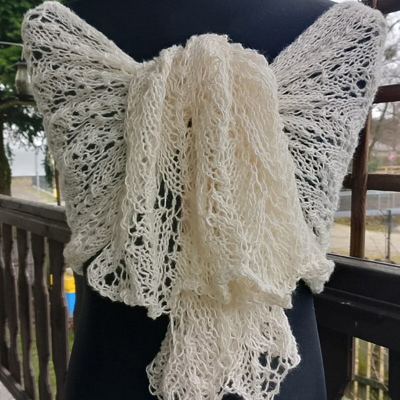 Wyjątkowo piękny szal wykonany w całości ręcznie. Użyto moheru, bardzo delikatnego w dotyku. Szal jest leciutki i ulotny jak mgiełka, a przy tym ciepły. Jest także plastyczny, dzięki czemu można kształtować go na wiele sposobów. Będzie doskonałym dodatkiem ślubnym, wieczorowym lub codziennym.